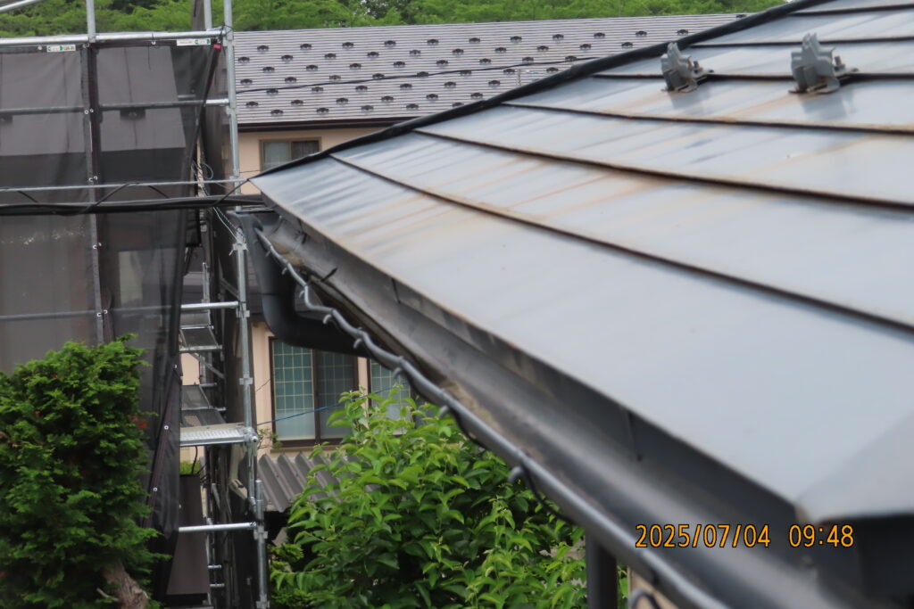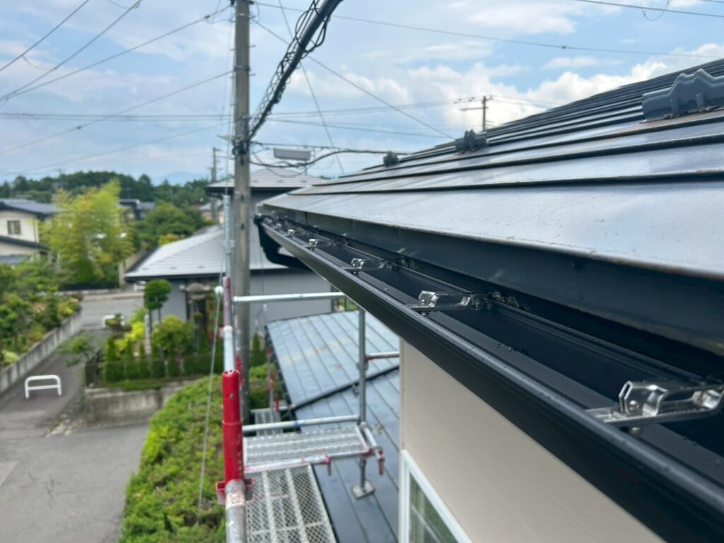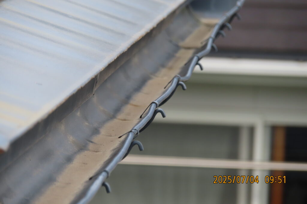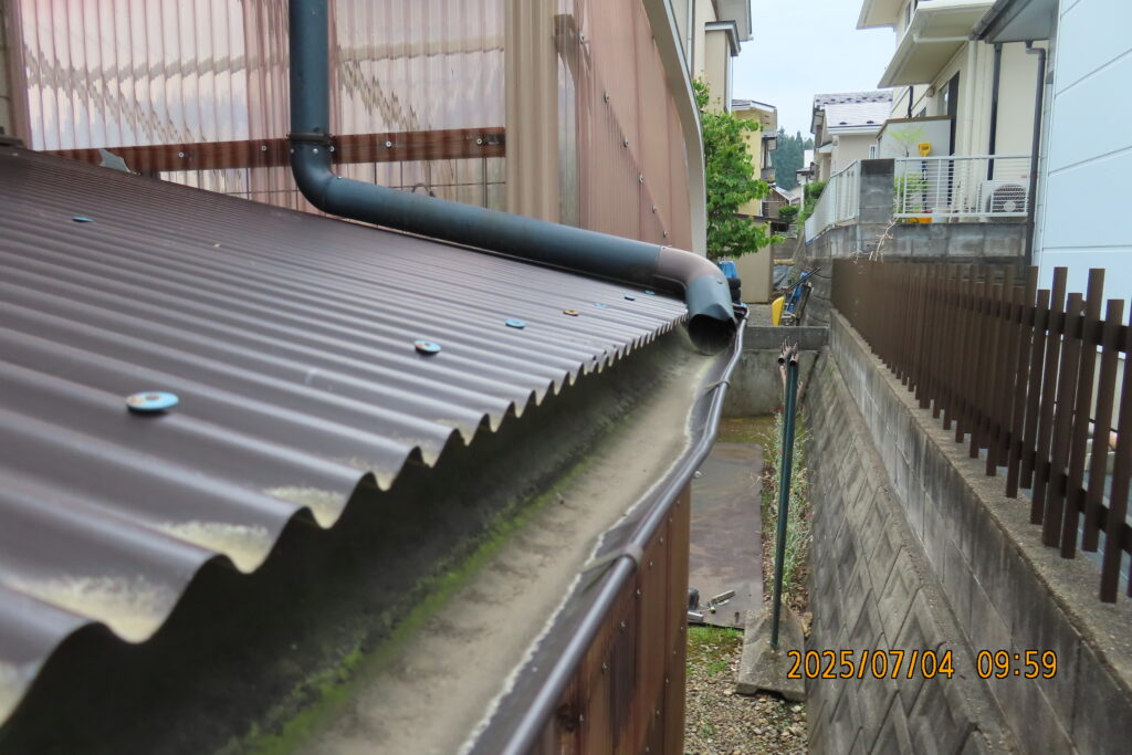 ② 軒樋のたわみ・勾配不良 経年劣化と積雪荷重の影響で、軒樋がたわみ、勾配が狂っていました。水がスムーズに流れない状態。