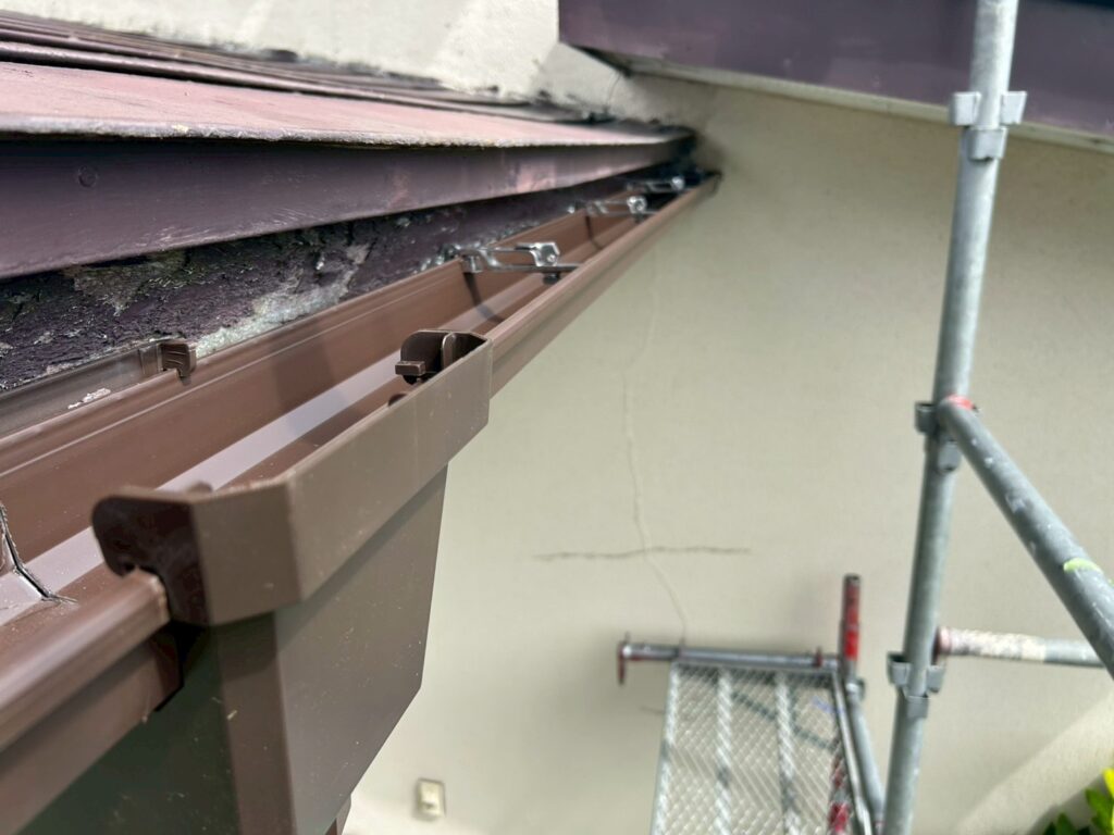 ⑤ 金具のサビ・緩み 金具にサビが発生し、固定力が低下。一部は緩んで軒樋が不安定になっていました。