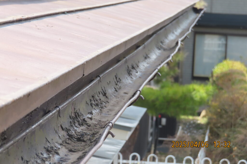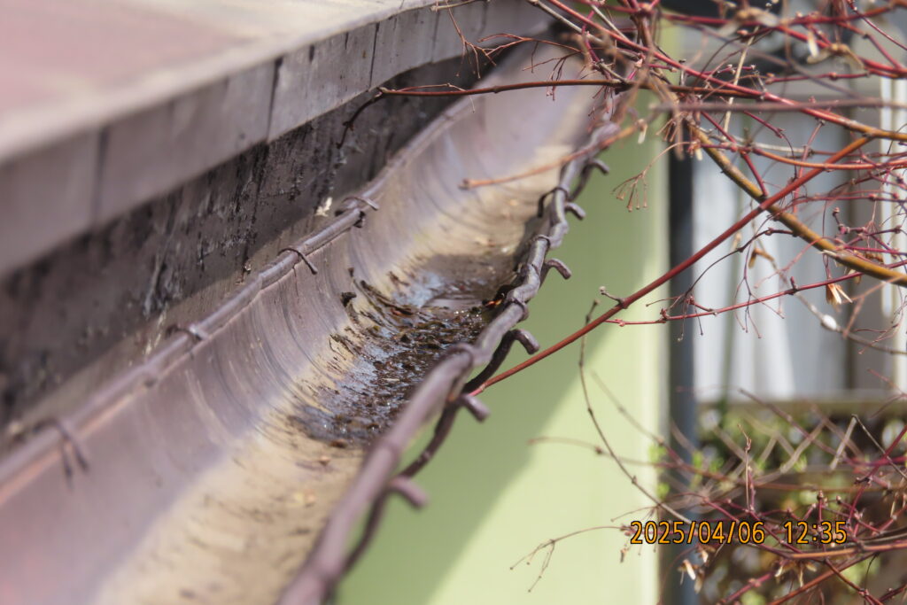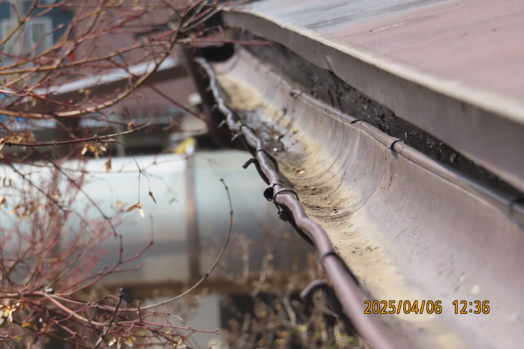 ④ 軒樋のたわみ・勾配不良 経年劣化と積雪荷重の影響で、軒樋がたわみ、勾配が狂っていました。水がスムーズに流れない状態。