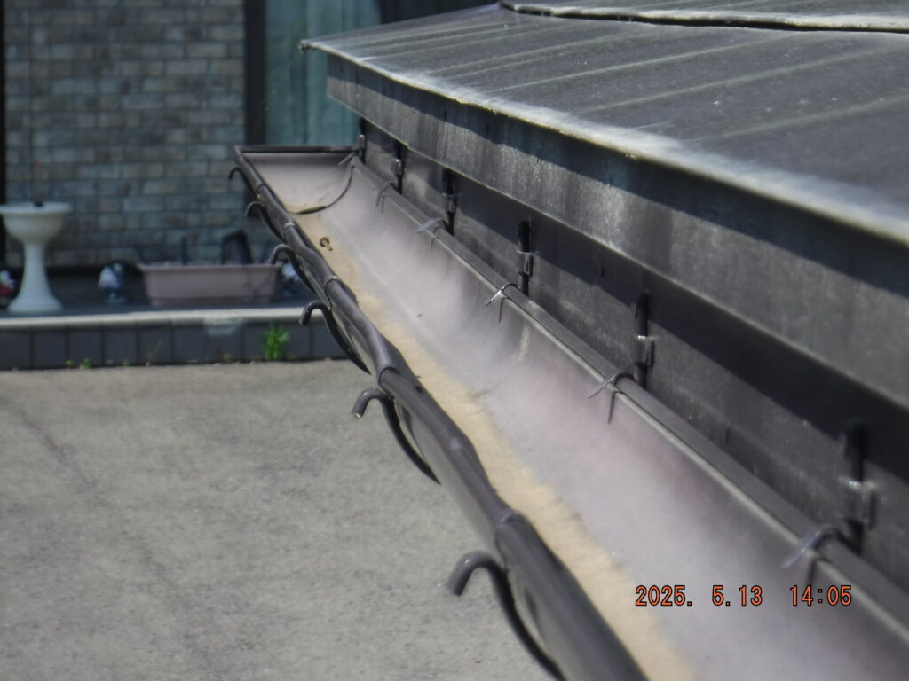 ① 軒樋全体の激しいサビ 鉄製の軒樋全体にサビが発生。特に継ぎ目や水が溜まりやすい部分は、サビが進行して赤茶色に変色していました。