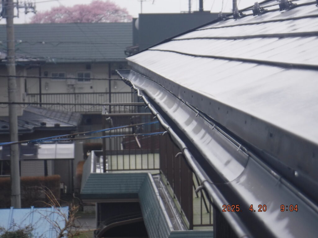 ✅ 剥がれている場所の真上に雨樋がある ✅ 雨樋の継ぎ目から水が漏れている ✅ 雨樋も白っぽく変色している ✅ 雨樋がたわんでいる