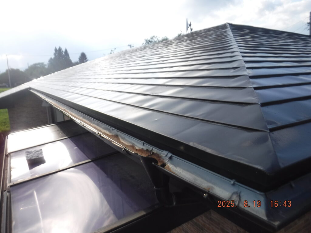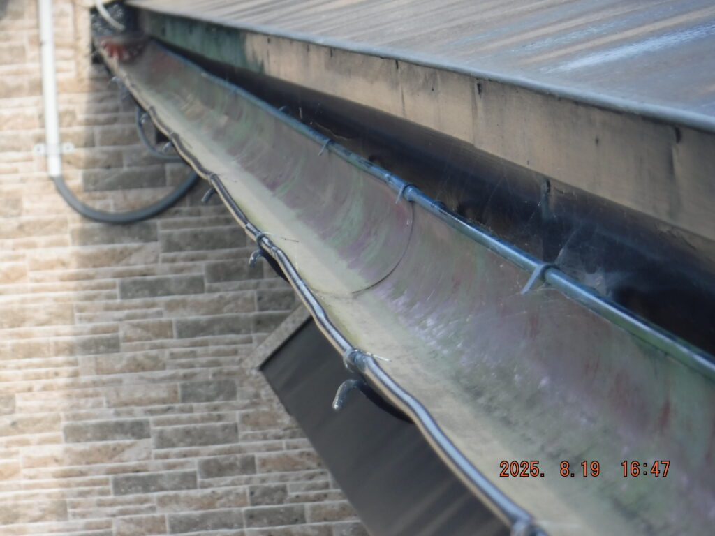 ③ 継ぎ目の隙間・破断 軒樋の歪みに伴い、継ぎ目が引っ張られて隙間が発生。雨水が漏れる状態になっていました。