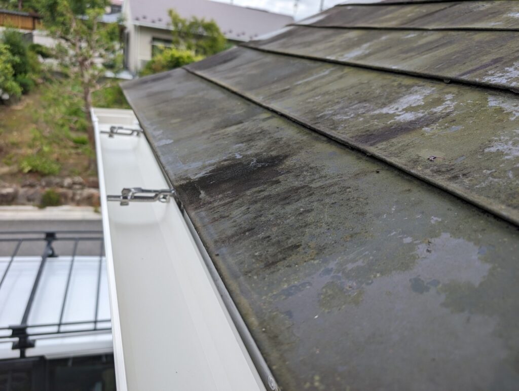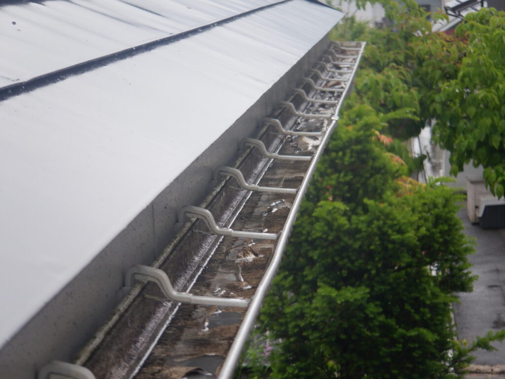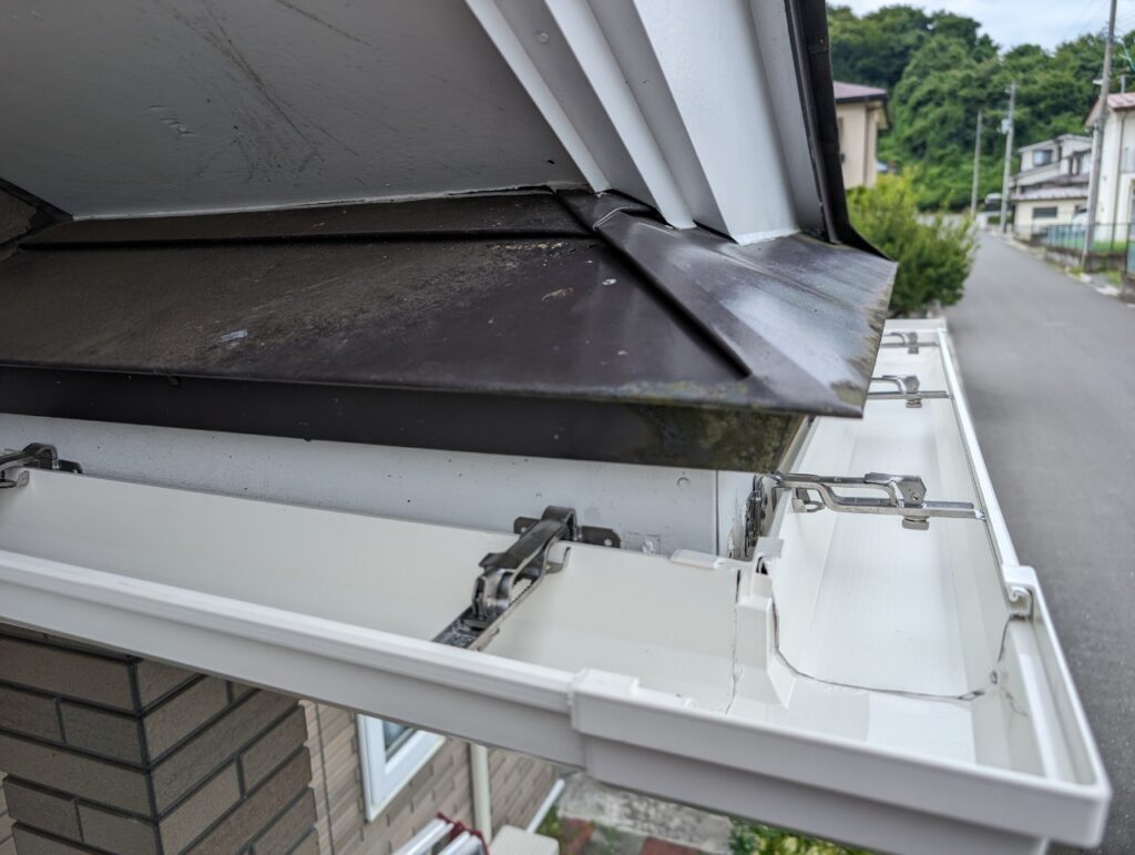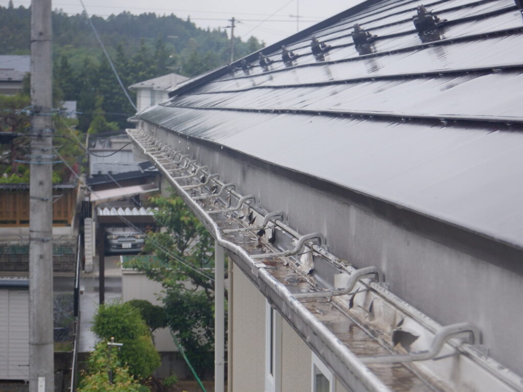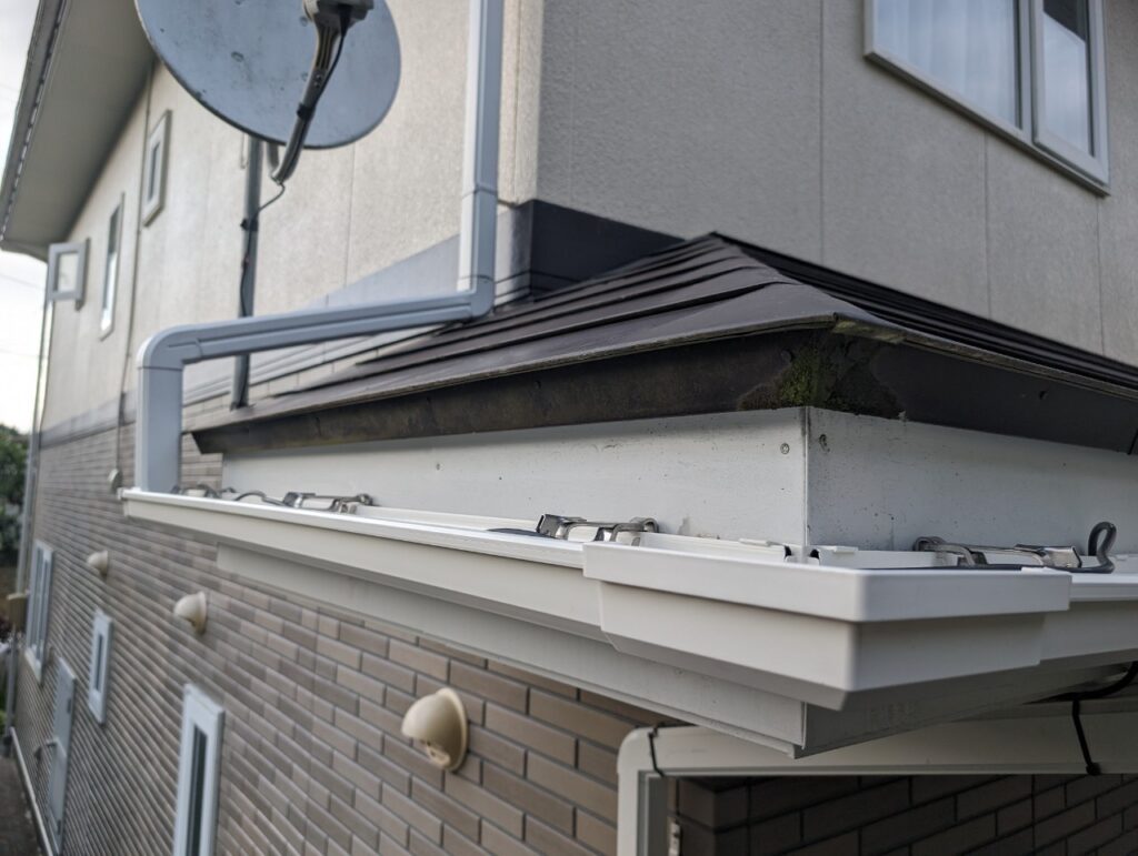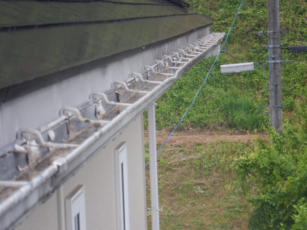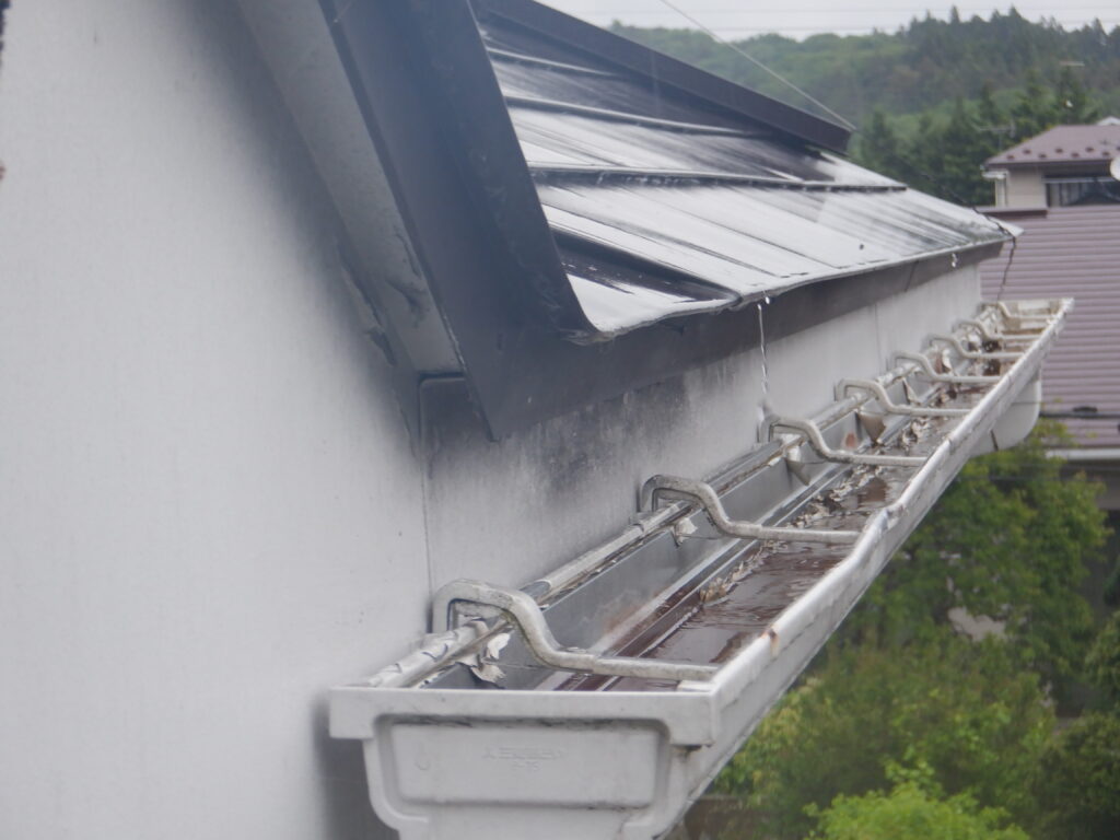 施工前の調査では、雨樋全体に歪みや破損が見られ、排水機能が低下している状態でした。固定金具についても傷みが進んでおり、雨樋を支える力が弱まっていました。一関市では冬季の積雪や凍結・融解の繰り返しにより、雨樋や金具に大きな負担がかかります。このまま放置すると、大雨や雪解け時に雨水があふれ、外壁や基礎への水浸入による建物全体の腐食や傷みにつながる恐れがありました。