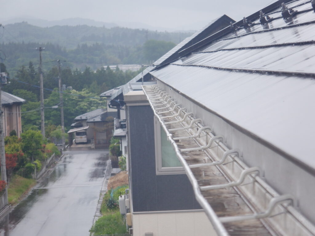 現地調査で雨樋と金具の状態を詳しく確認し、全体交換が必要と判断しました。まず傷んだ雨樋と固定金具をすべて撤去し、積雪対応の強化型金具を新たに取り付けました。その後、高耐久型の雨樋を適切な排水勾配を確保しながら設置。一関市の気候条件に対応できるよう、積雪荷重や凍結にも耐えられる仕様で施工を行っています。