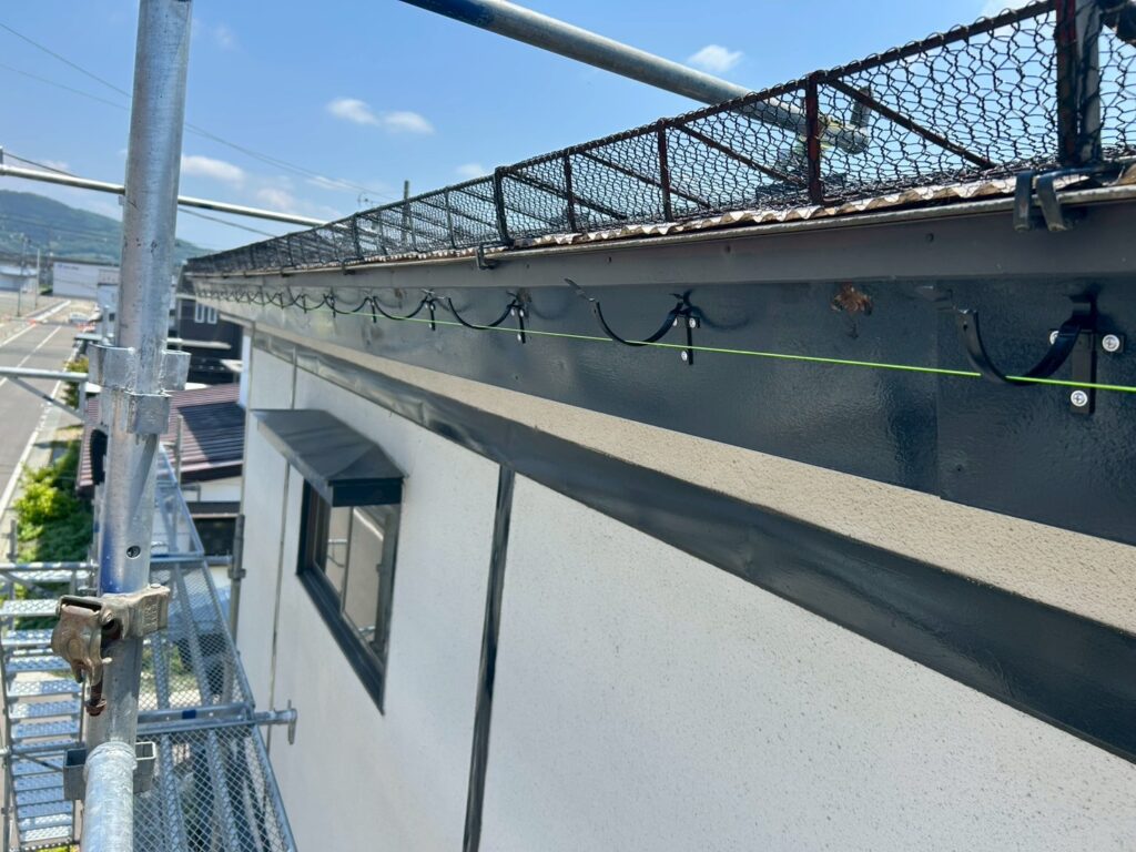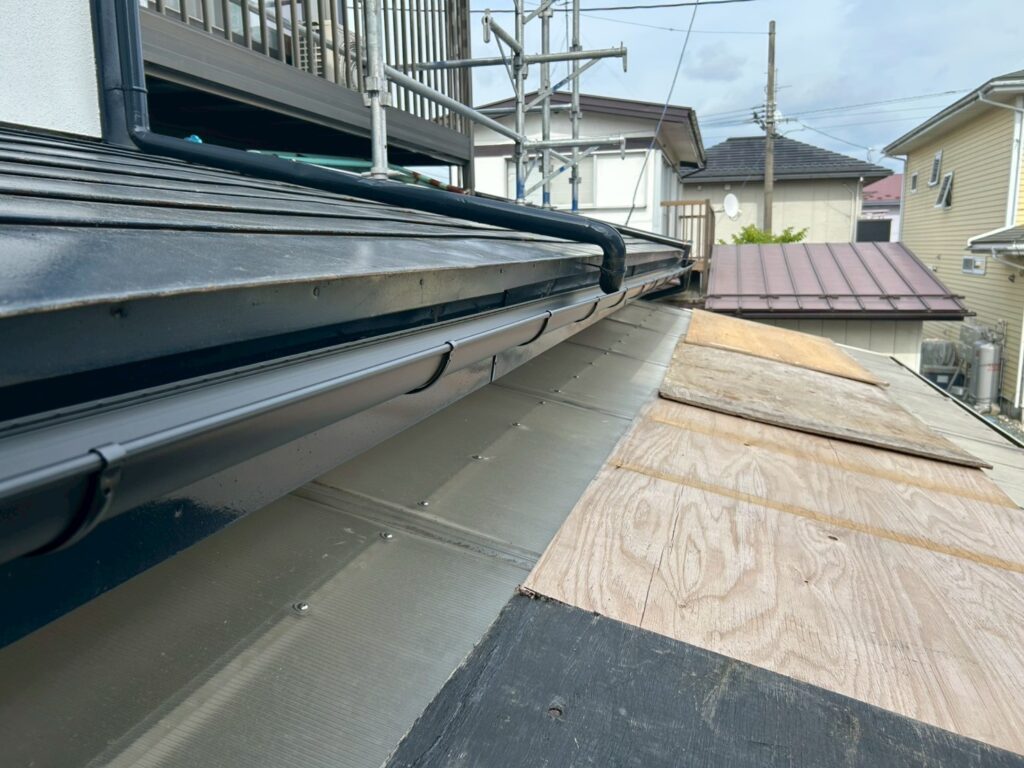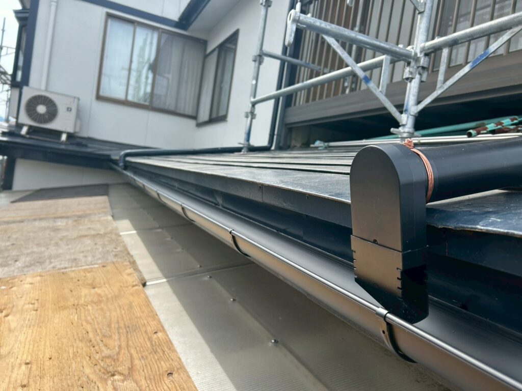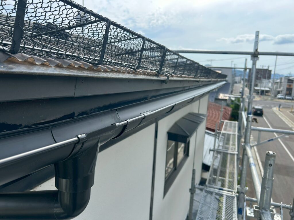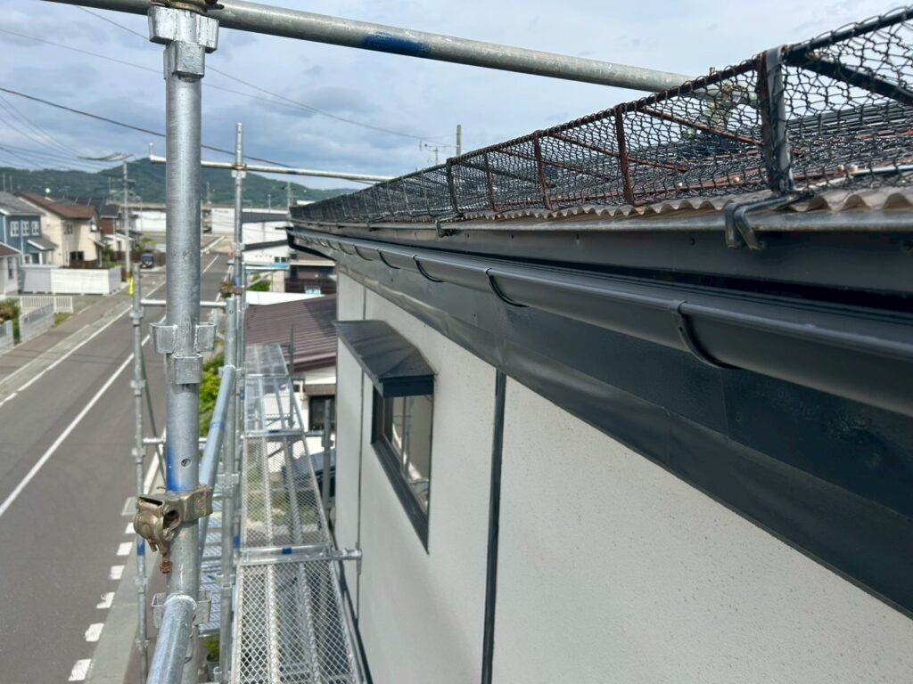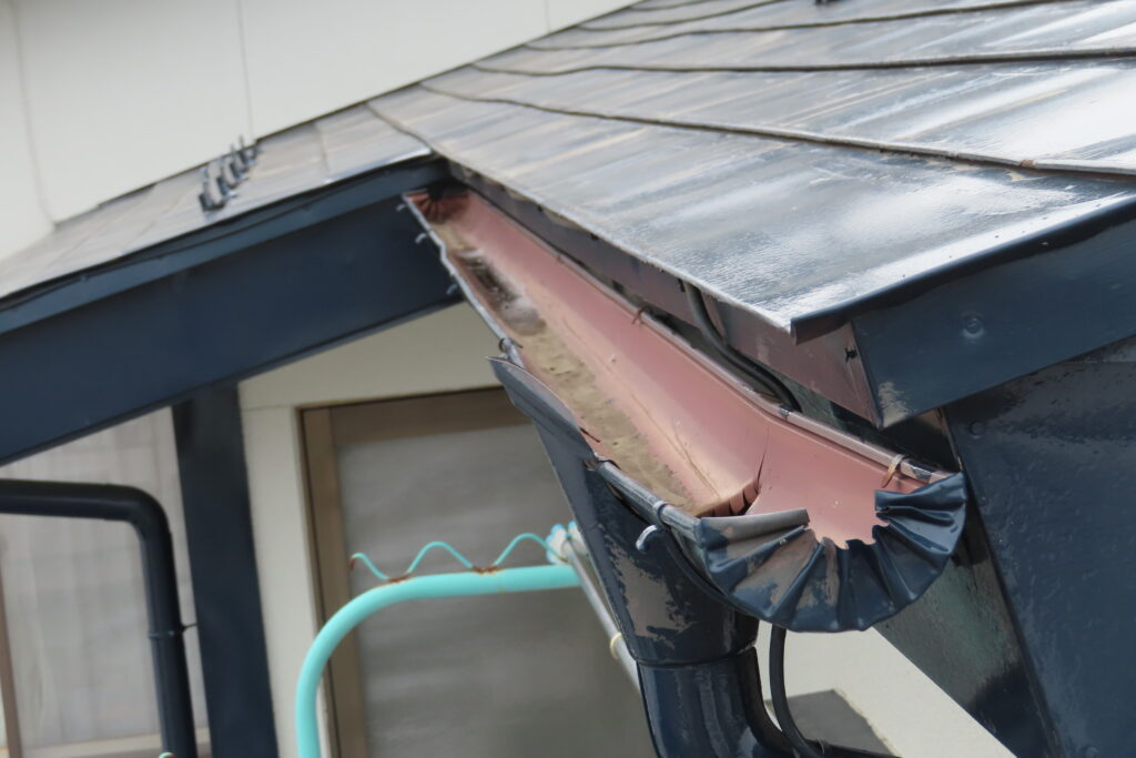 既存の雨樋には歪みや継ぎ目のズレが見られ、強い雨や雪解けの時期には水があふれやすい状態でした。このまま放置すると、外壁の汚れや劣化、基礎まわりへの影響が懸念される状況でした。