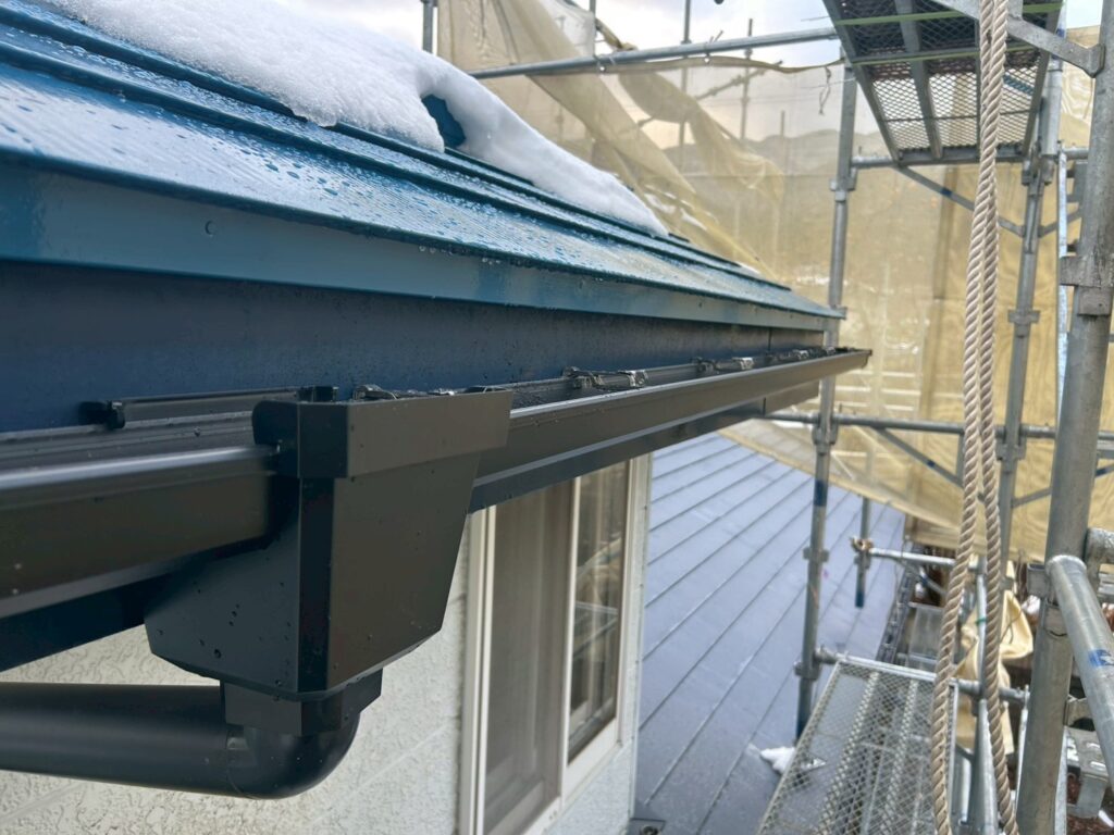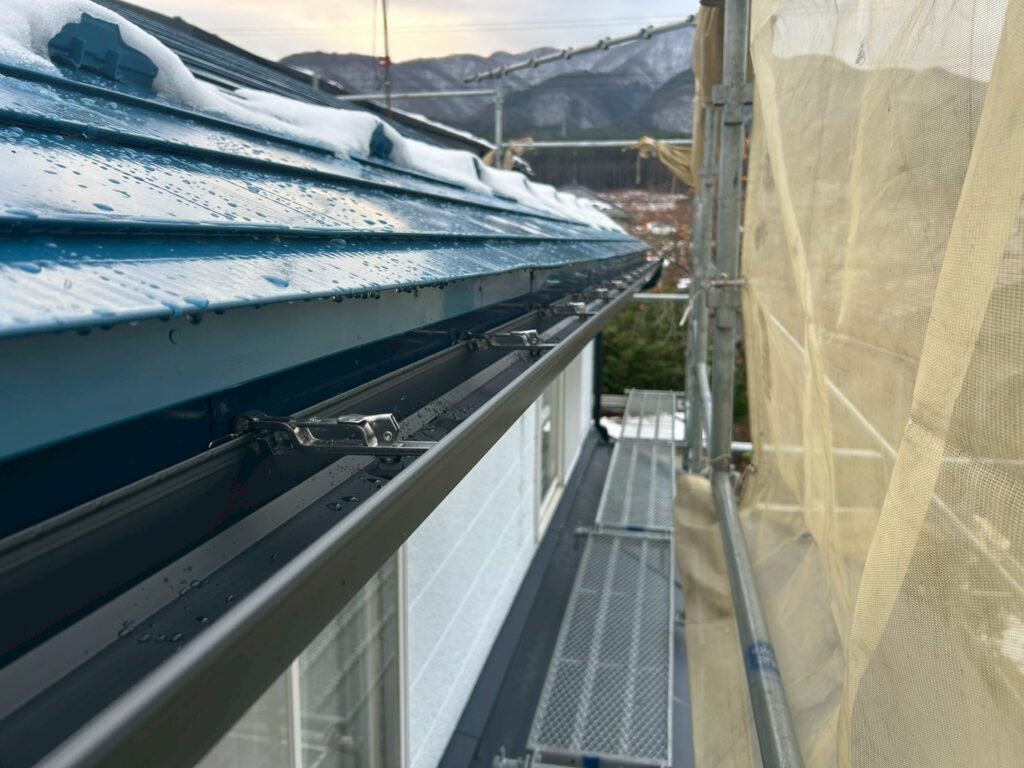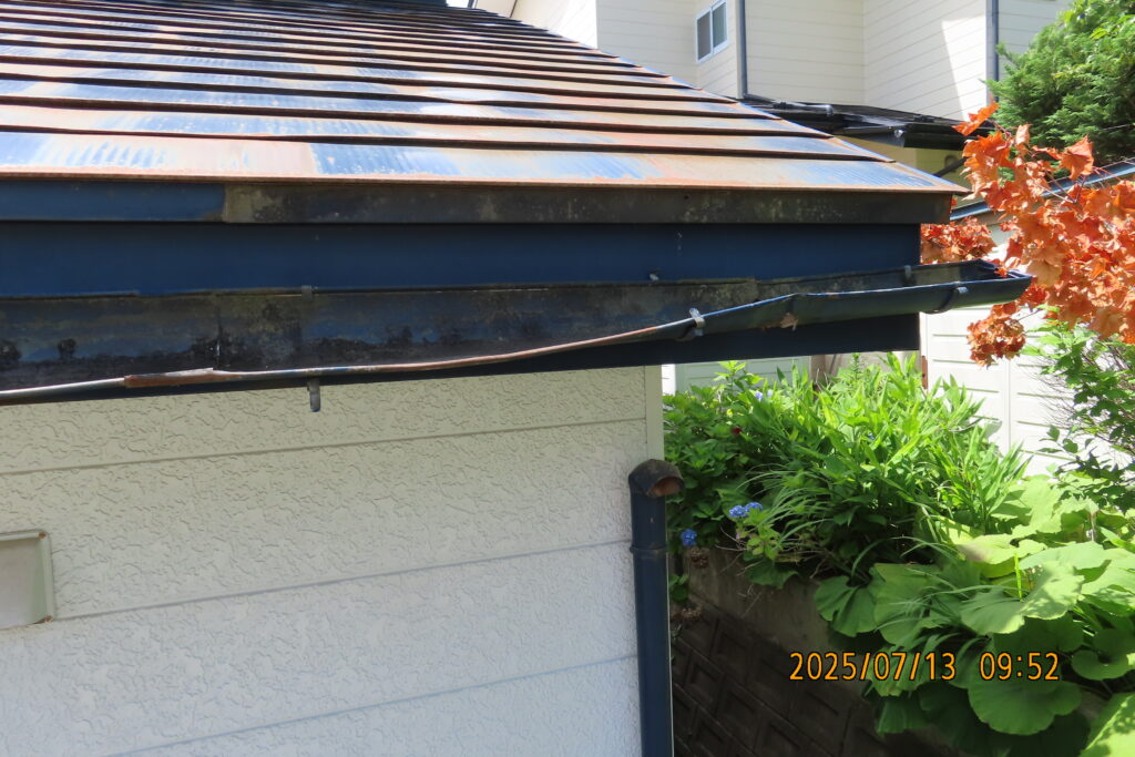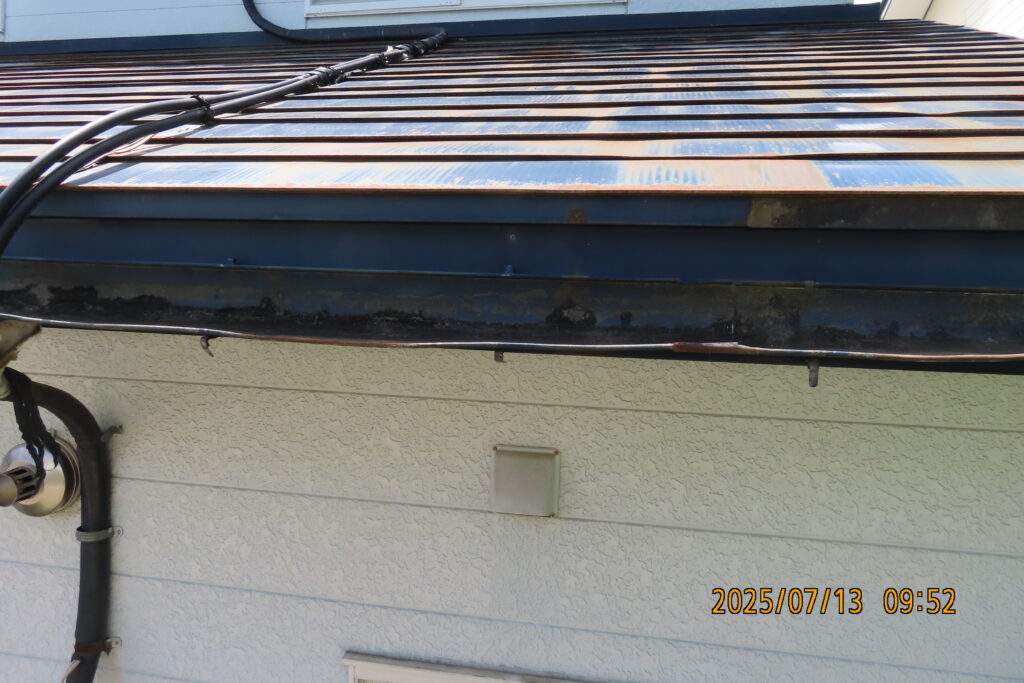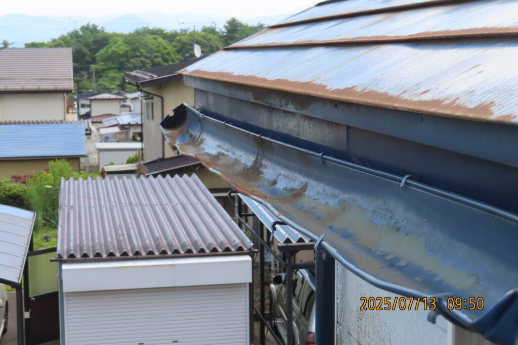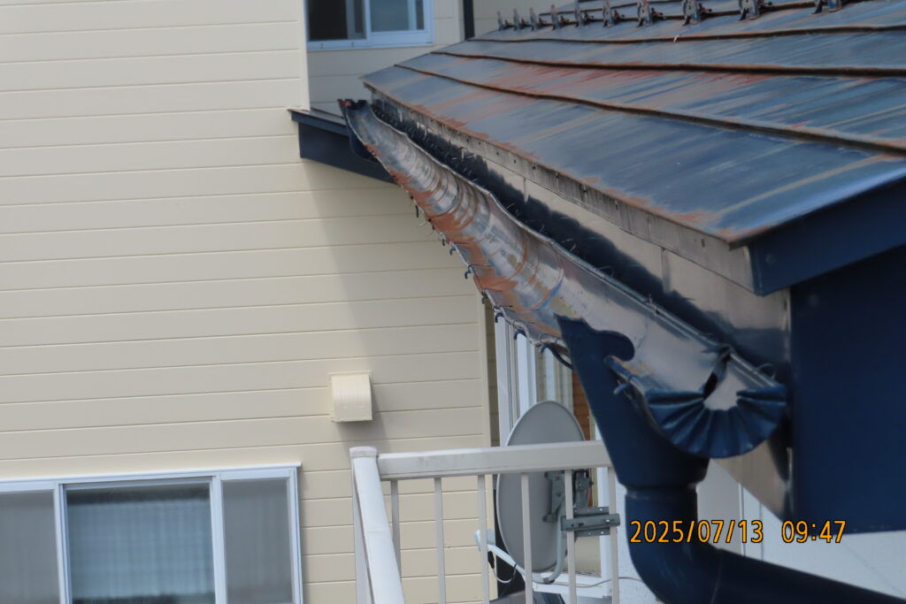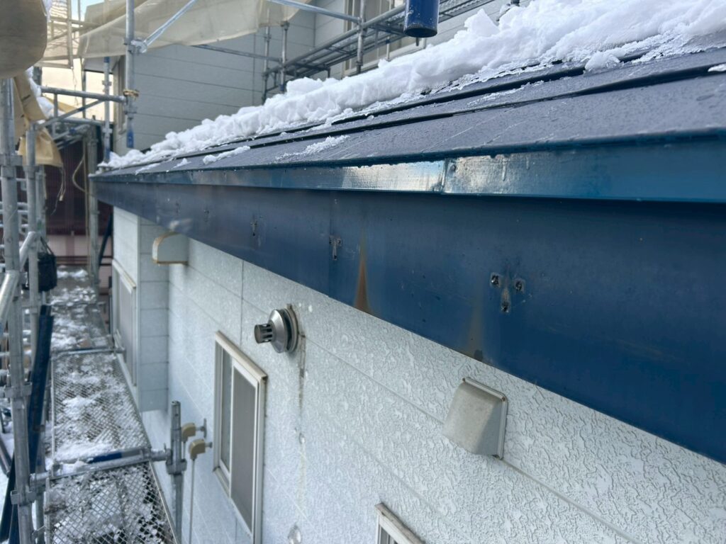 ⑥ 軒樋の変形・歪み 積雪荷重と経年劣化で軒樋が変形。勾配が狂い、水がたまる箇所がありました。