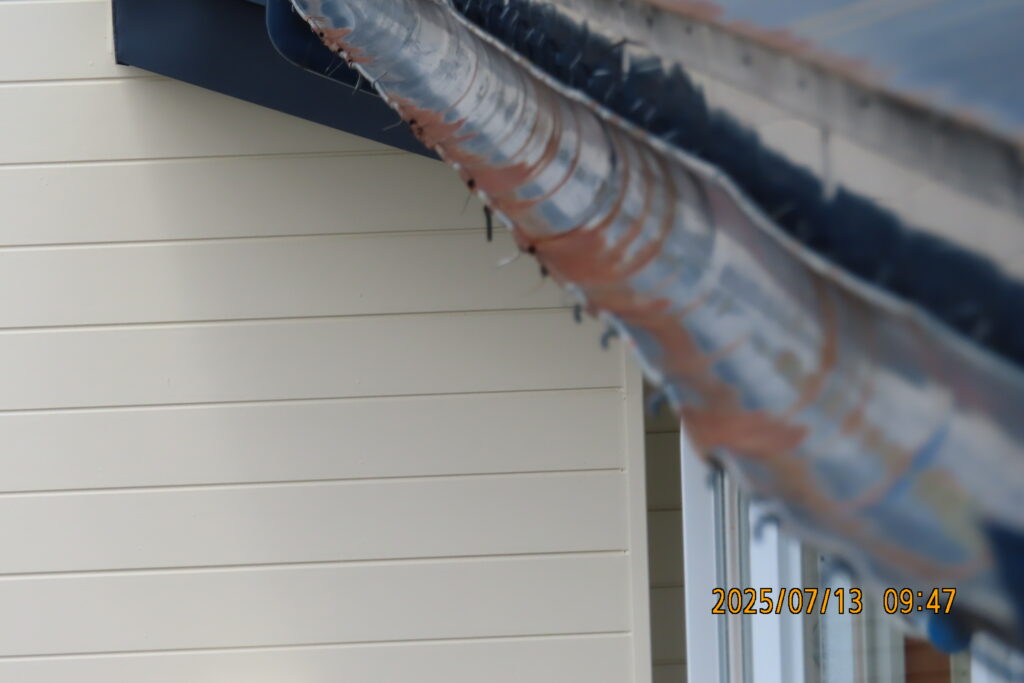 ⑦ 金具のサビ・緩み 金具がサビて固定力が低下。一部は緩んで雨樋が不安定になっていました。