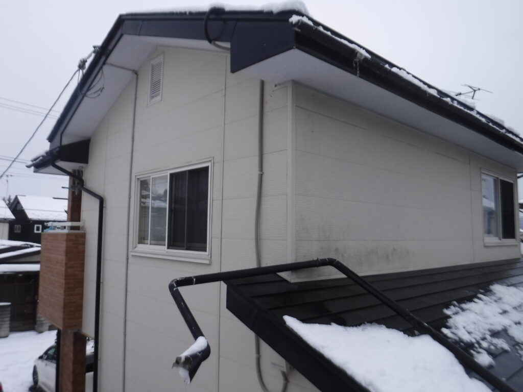 施工のポイント: 滝沢市は積雪量が多いため、雨樋は積雪対応仕様で施工。金具間隔を詰め、次の大雪にも耐えられるようにしました。