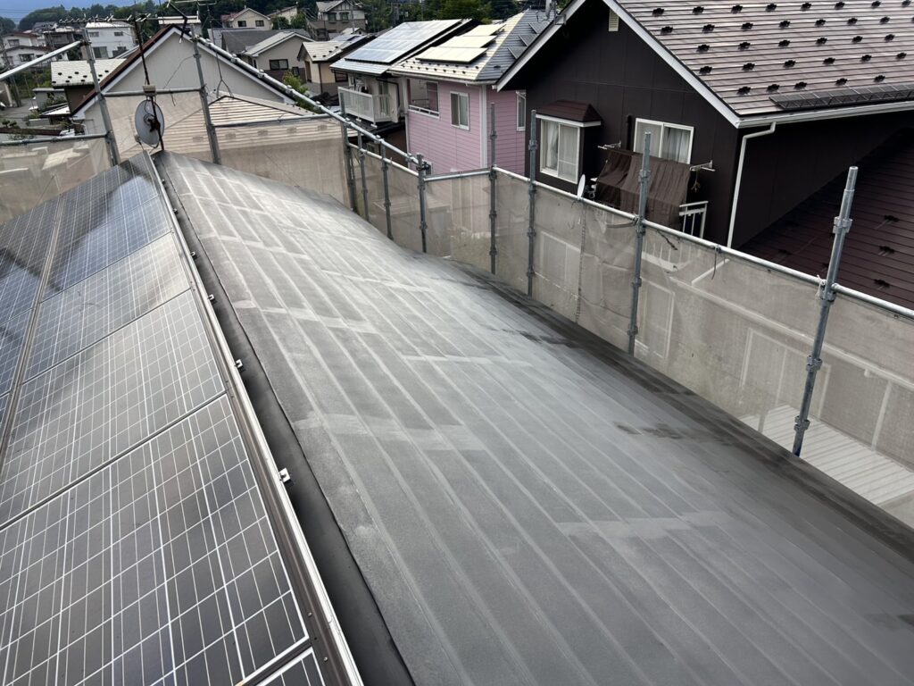 ⑥ チョーキング(白亜化) 屋根材の塗膜が劣化し、触ると白い粉が手につく状態(チョーキング)が発生していました。