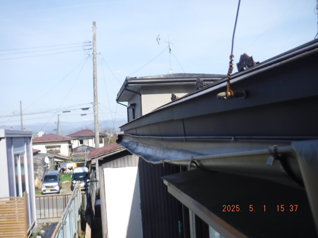 ④ 金具のサビ・破損 金具にサビが進行し、一部は完全に破損。軒樋を支える力が弱まっていました。
