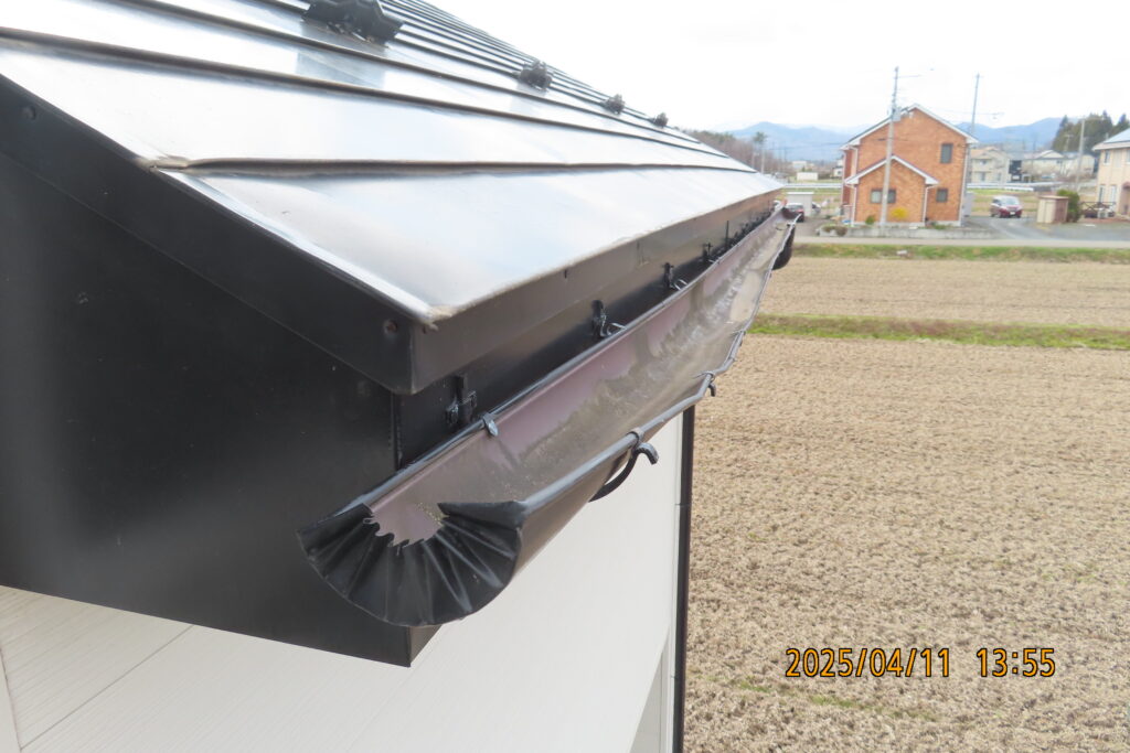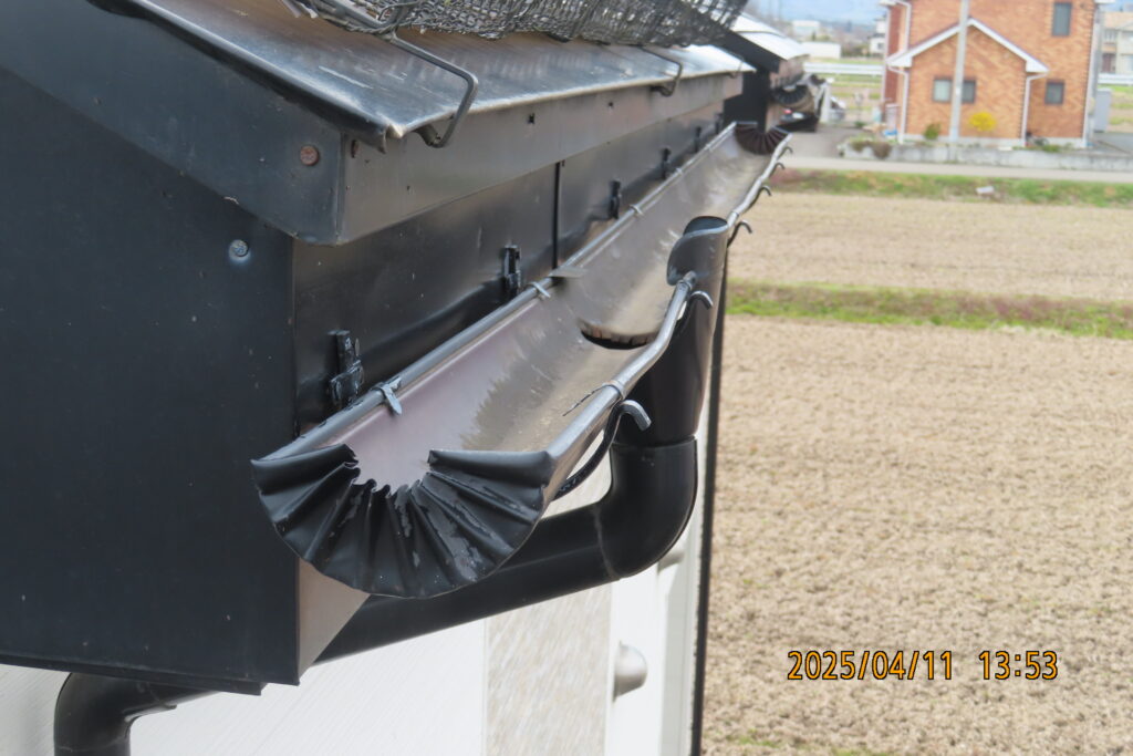さらに、落雪の衝撃で雨樋も歪んでしまい、排水不良も発生していました。