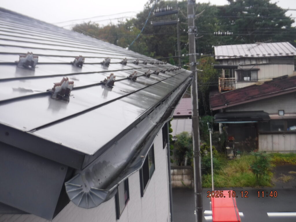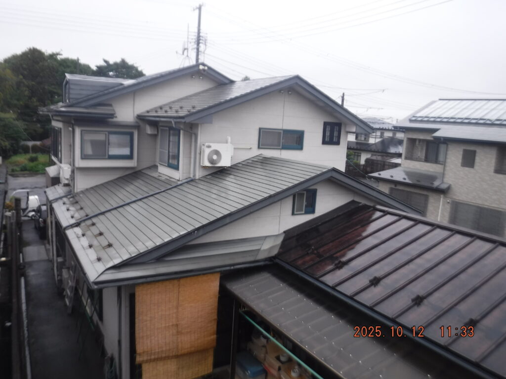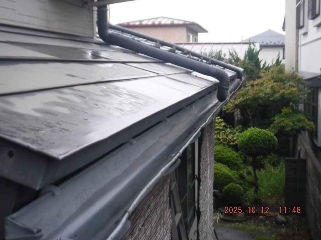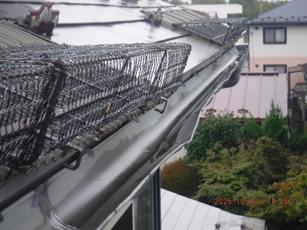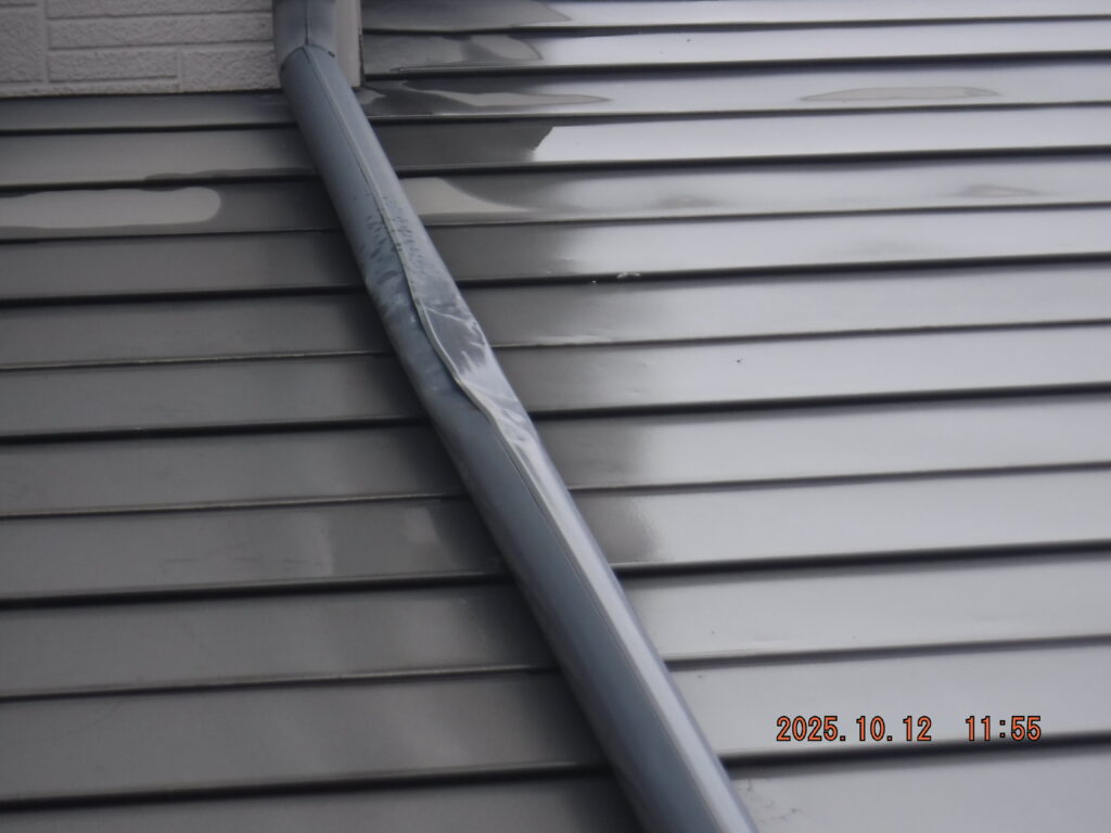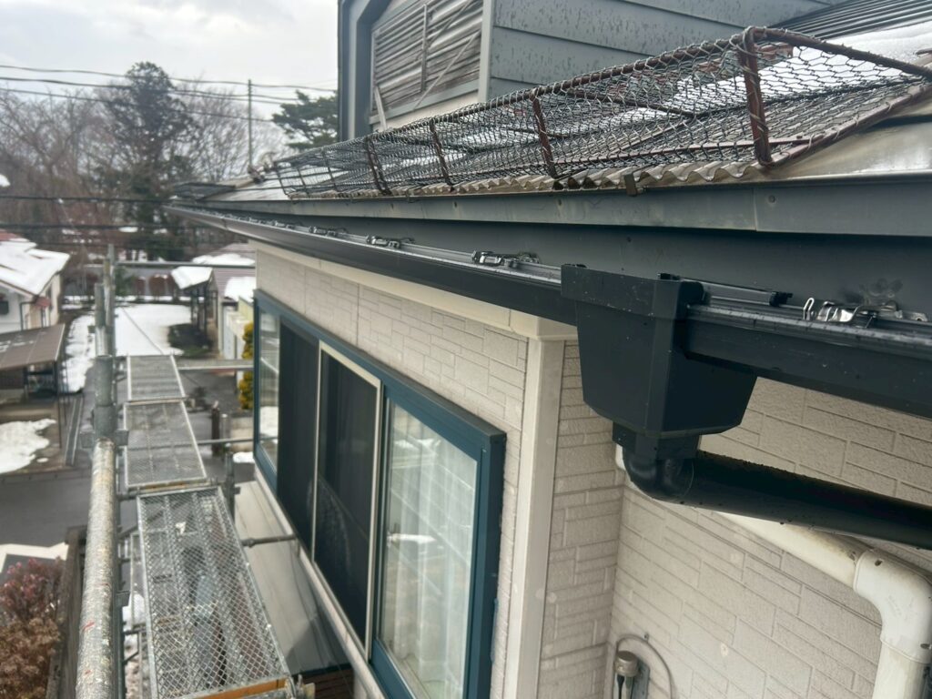 施工のポイント: 縦樋と排水管の接続部分は特に丁寧に処理。将来的な詰まり防止のため、落ち葉よけネットの設置もご提案しました。