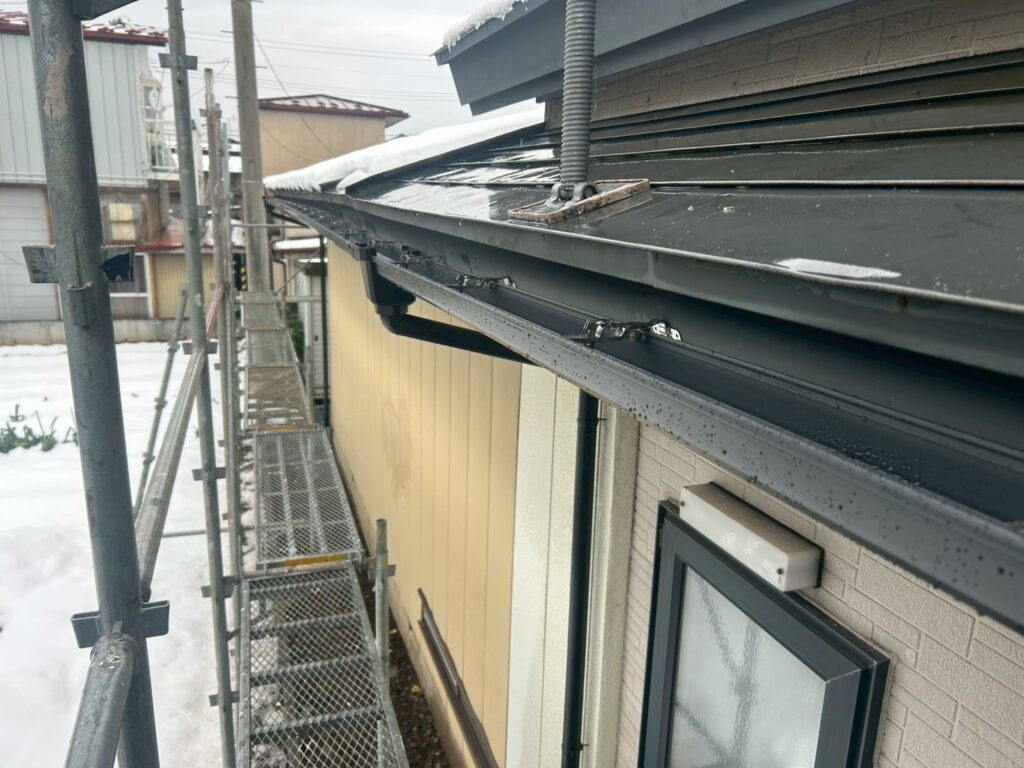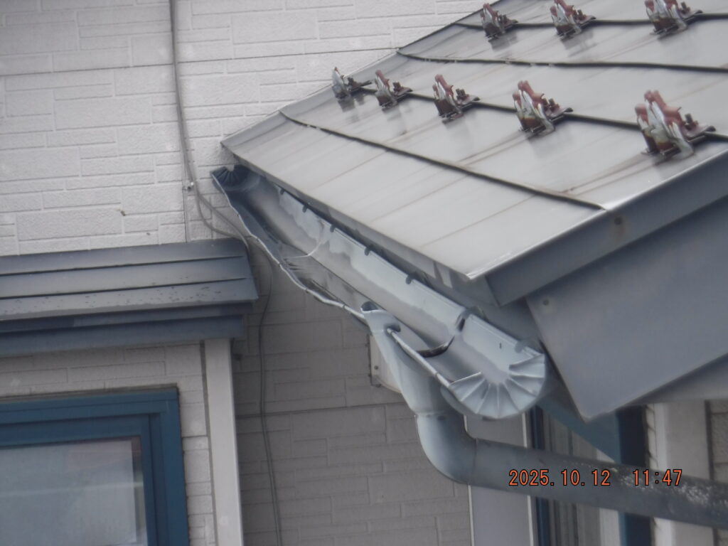 ④ 軒樋の勾配不良 経年劣化と積雪荷重の影響で軒樋の勾配が狂い、水が集水器に向かってスムーズに流れない状態でした。