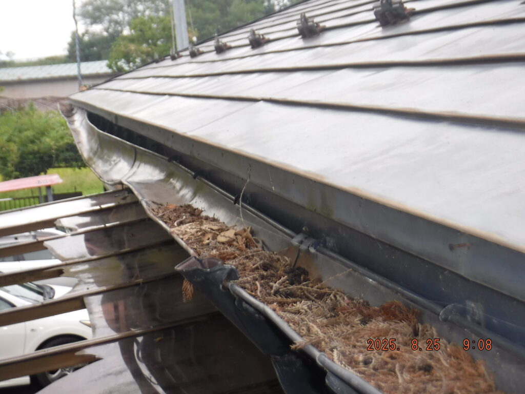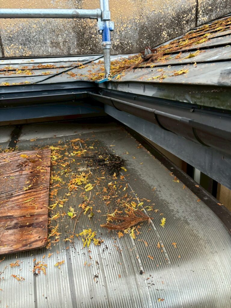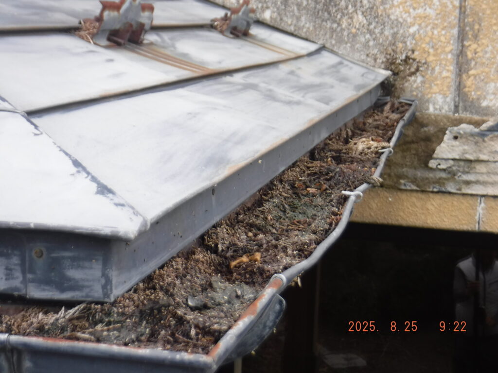 ① 軒樋の詰まり・堆積物 屋根から流れ込んだ土砂や落ち葉が軒樋内に堆積。排水を妨げ、雨水があふれる原因になっていました。