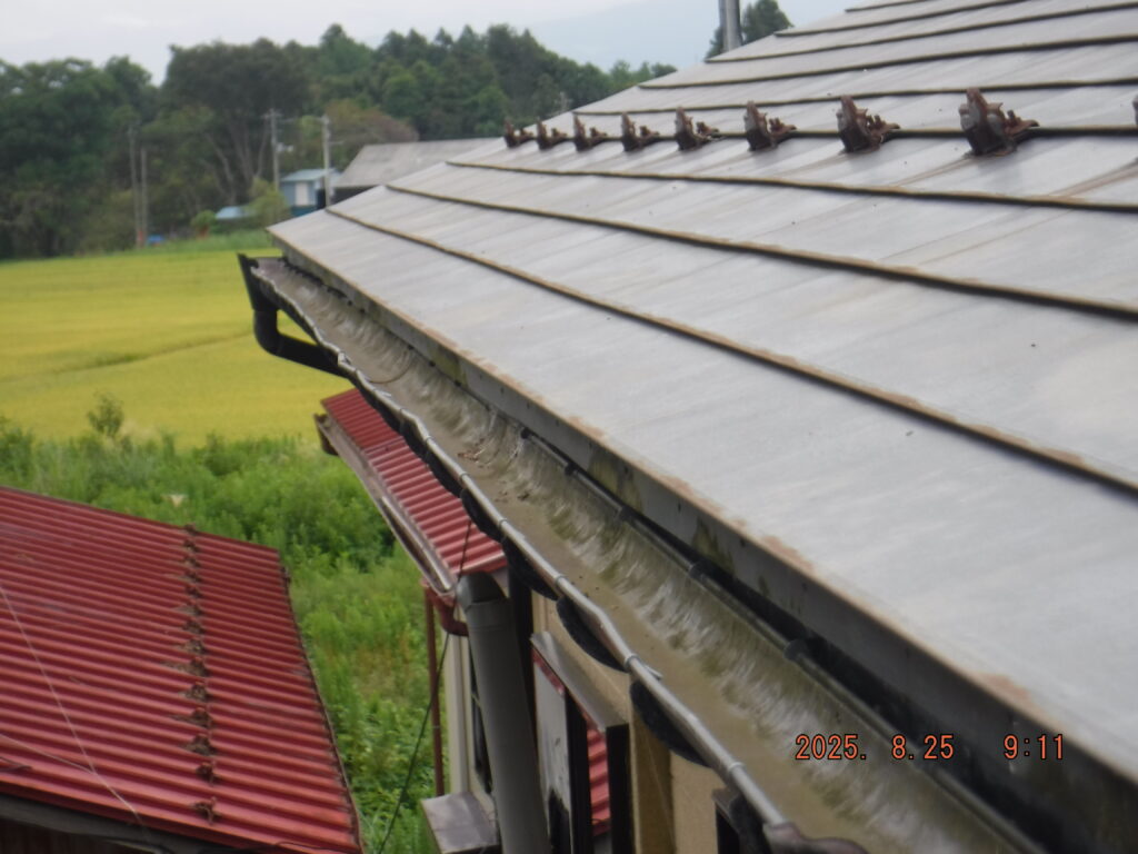 ④ 金具のサビ・緩み 金具がサビて固定力が低下。一部は緩んで軒樋が傾いていました。