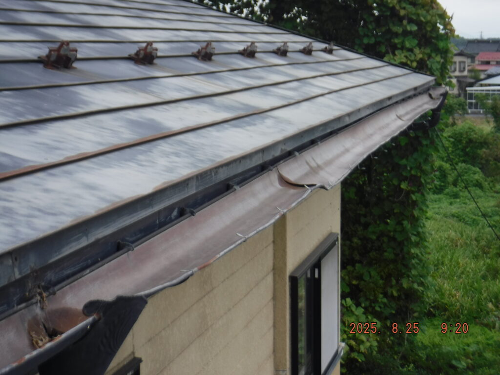 ② 勾配の狂い 経年劣化と積雪荷重の影響で軒樋の勾配が狂った状態。水が集水器に向かって流れず、駐車スペース側であふれていました。