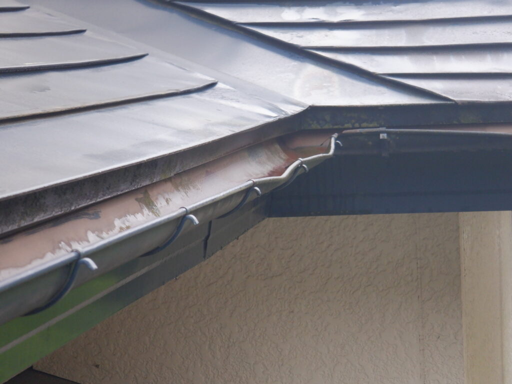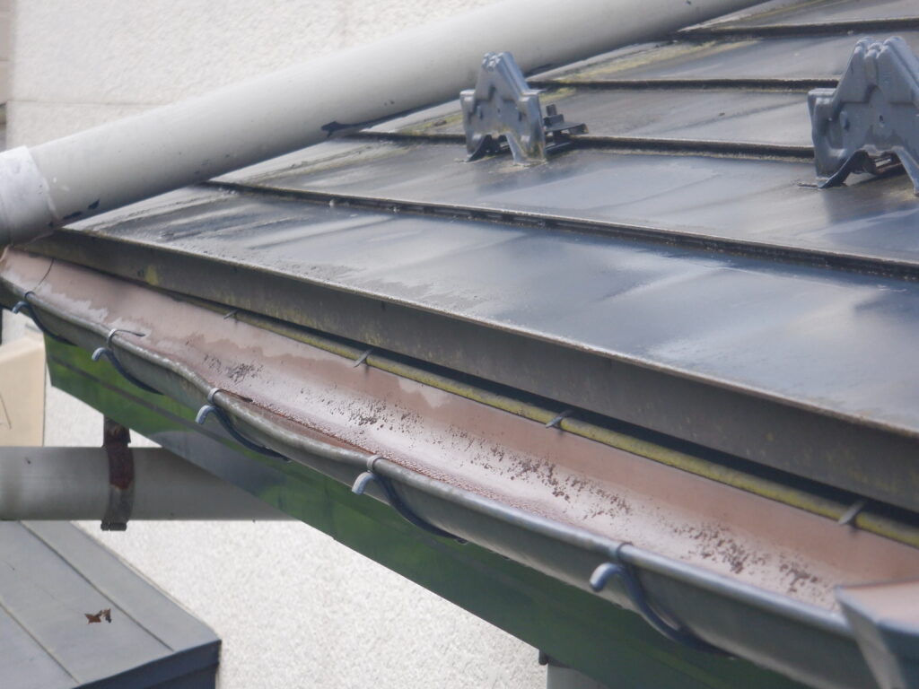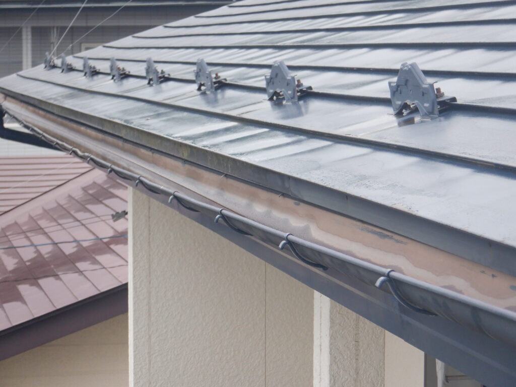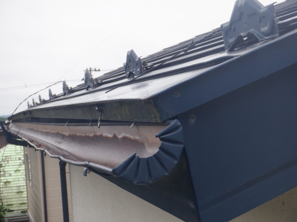 施工前の調査では、雨樋全体に歪みや変形が見られ、複数箇所で排水不良を起こしている状態でした。固定金具についても緩みや傷みが確認され、雨樋を支える力が弱まっていました。一関市では冬季の積雪や凍結・融解の繰り返しにより、雨樋や金具に大きな負担がかかります。このまま放置すると、大雨や雪解け時に雨水があふれ、外壁や基礎への水浸入による建物全体の傷みにつながる恐れがありました。