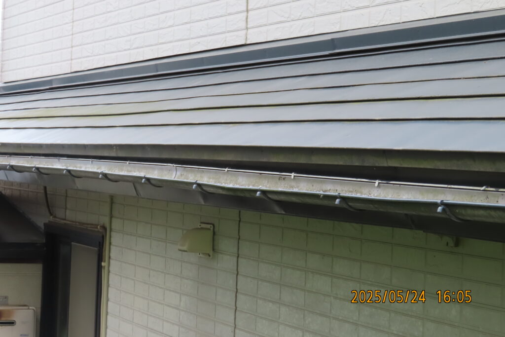 ② 雨樋が歪み、雨水があふれる状態 金具が緩み、雨樋が傾いていたため、大雨時に排水が追いつかずオーバーフロー。外壁を直撃していました。