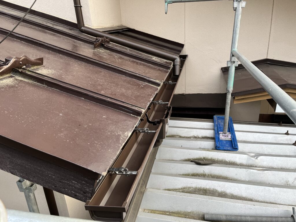 施工前の調査では、雨樋全体に歪みや破損が見られ、排水機能が低下している状態でした。固定金具についても傷みが進んでおり、雨樋を支える力が弱まっている箇所が確認されました。滝沢市では冬季の積雪や凍結・融解の繰り返しにより、雨樋や金具に大きな負担がかかります。このまま放置すると、大雨や雪解け時に雨水があふれ、外壁や基礎への水浸入による建物全体の腐食や傷みにつながる恐れがありました。