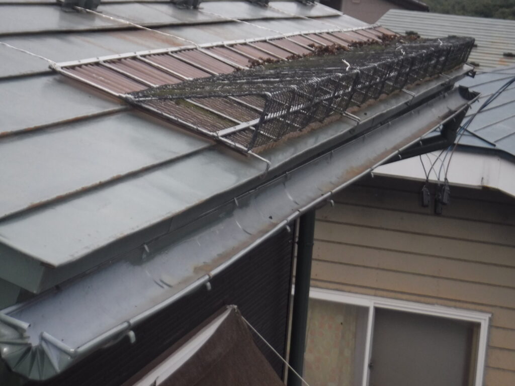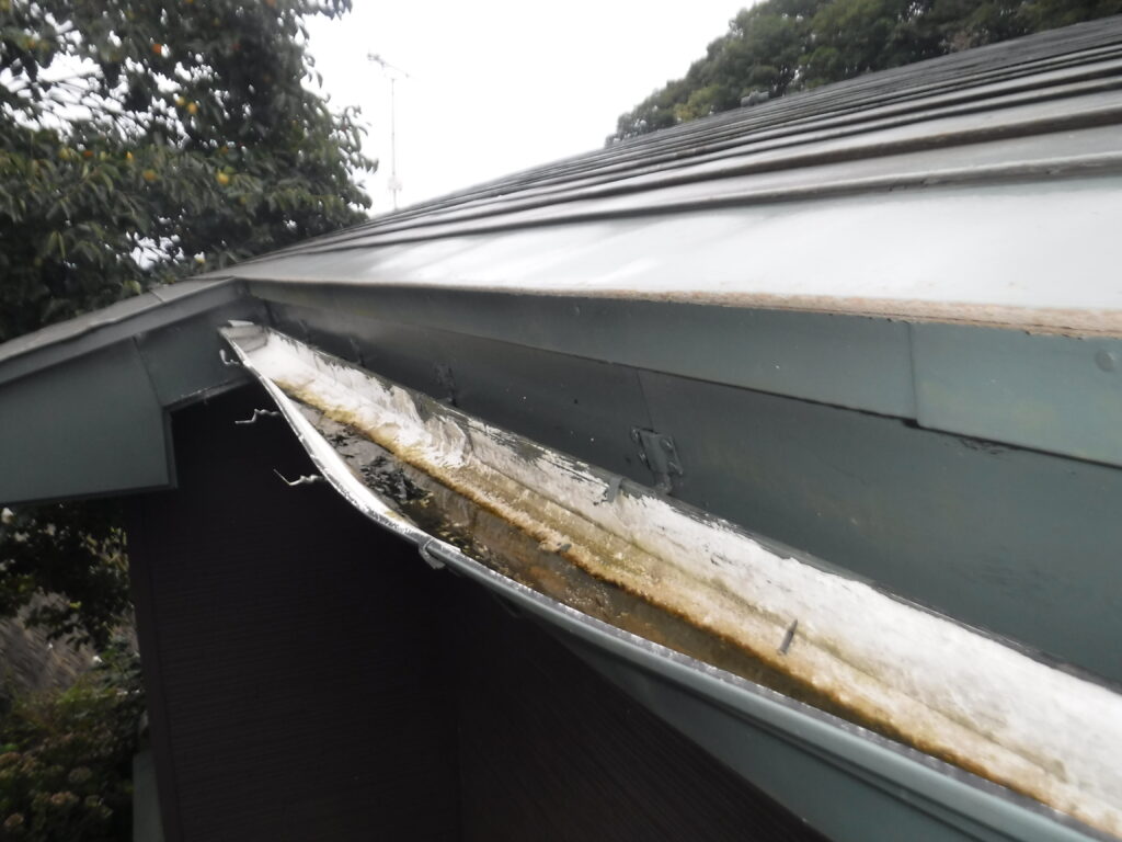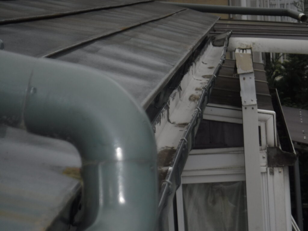 施工前の点検では、雨樋全体にわたって歪みや変形が発生しており、複数箇所で排水不良が確認されました。金具についても長年の積雪荷重や凍結・融解の繰り返しにより固定力が低下し、雨樋をしっかりと支えられない状態になっていました。このまま放置すると、雨水や雪解け水が外壁を伝って流れ落ち、外壁の汚れや傷み、さらには基礎部分への浸水被害を引き起こす恐れがありました。