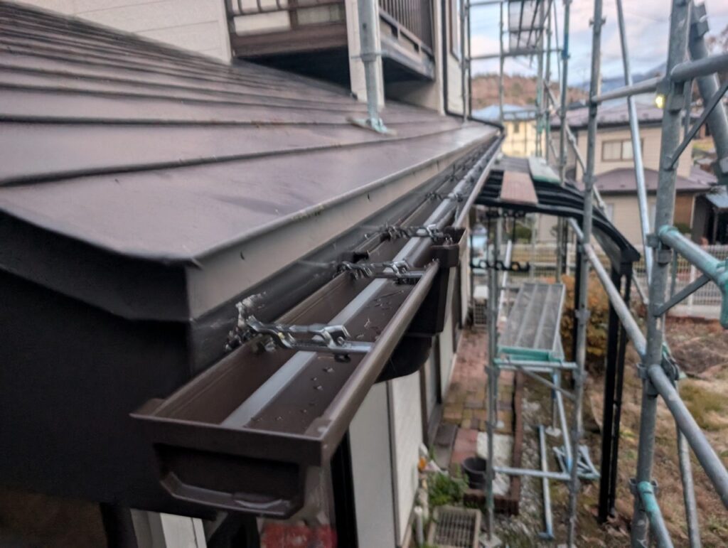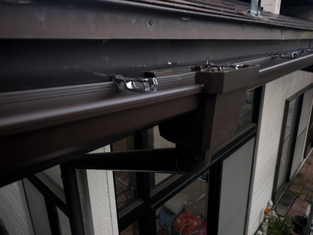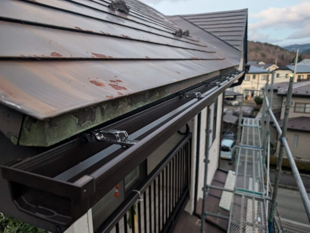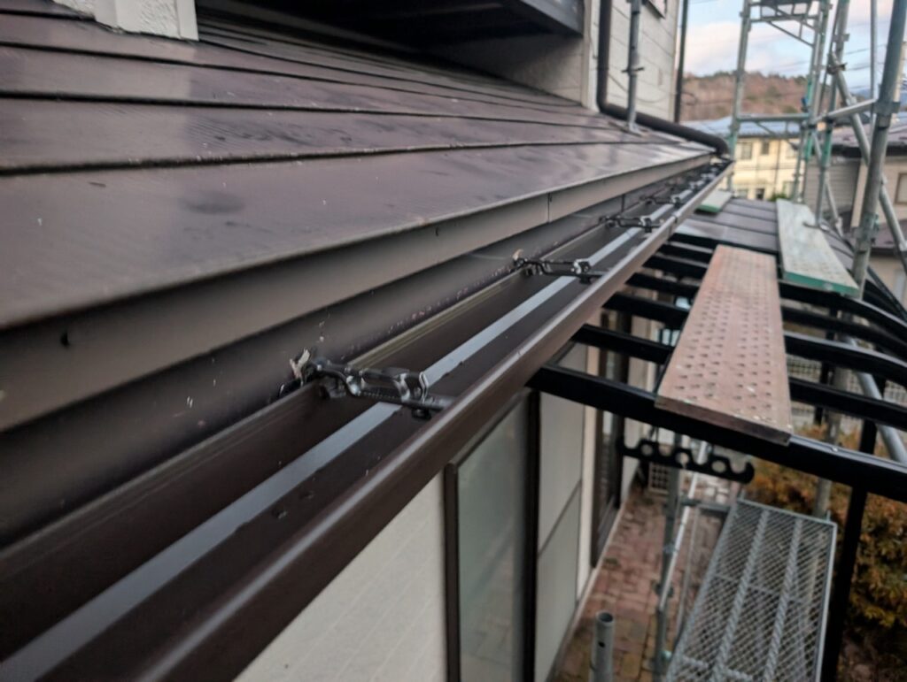 施工前の調査では、雪止めが設置されておらず、冬季に屋根からの落雪が懸念される状態でした。雨樋についても歪みや破損が見られ、雨水や雪解け水を正常に排出できない状態でした。盛岡市のような積雪地域では、雪止めがないと落雪による事故やカーポート・植栽の破損、また雨樋自体が雪の重みで損傷するリスクがあります。このまま放置すると、外壁や基礎への水の浸入、周囲への落雪被害といった問題につながる恐れがありました。