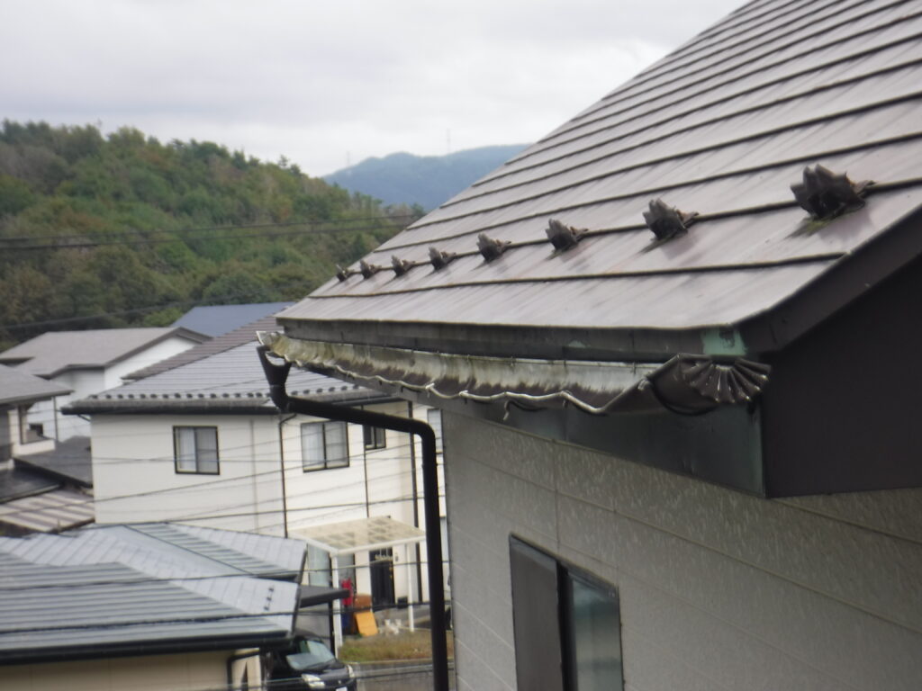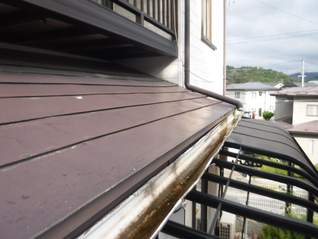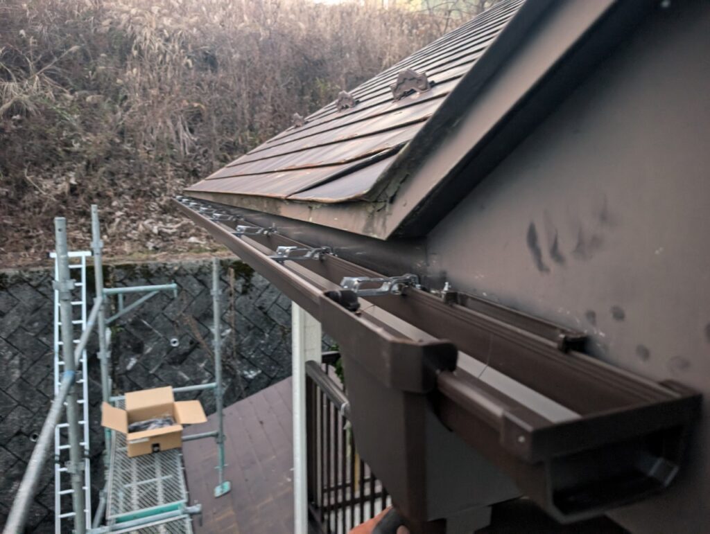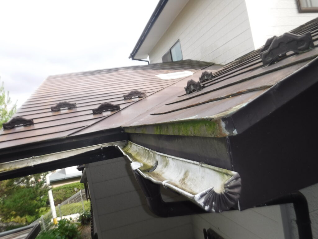 施工前の調査では、雪止めが設置されておらず、冬季に屋根からの落雪が懸念される状態でした。雨樋についても歪みや破損が見られ、雨水や雪解け水を正常に排出できない状態でした。盛岡市のような積雪地域では、雪止めがないと落雪による事故やカーポート・植栽の破損、また雨樋自体が雪の重みで損傷するリスクがあります。このまま放置すると、外壁や基礎への水の浸入、周囲への落雪被害といった問題につながる恐れがありました。